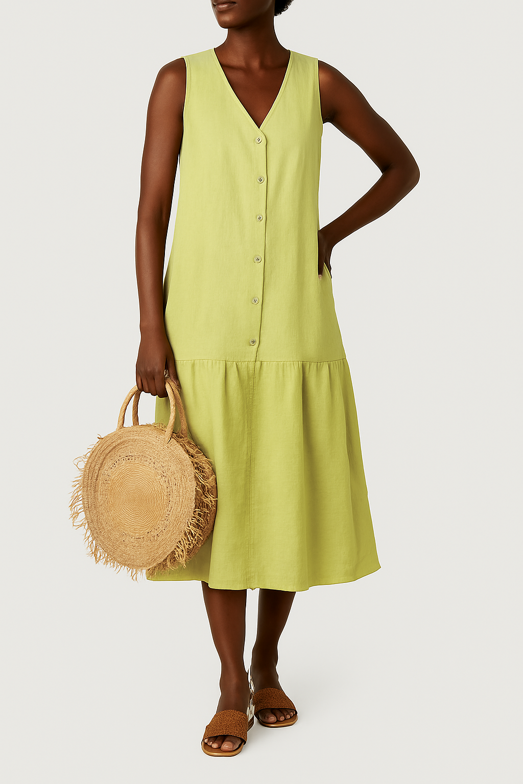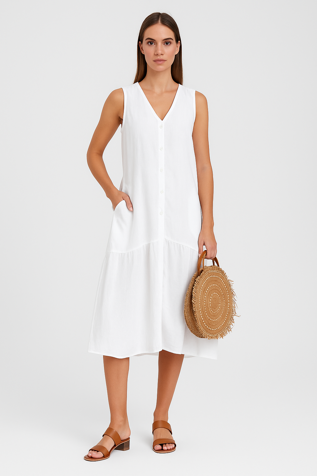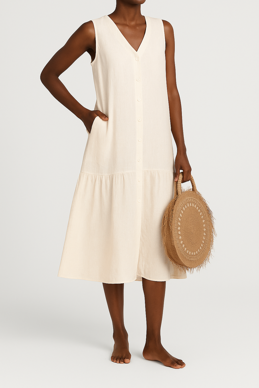 Hergestellt aus hochwertigem Leinenstoff, bietet dieses Kleid den ganzen Tag über Komfort. Der vielseitige Stil lässt sich leicht sowohl mit Pfennigabsätzen als auch mit Sandalen kombinieren, je nach Anlass.